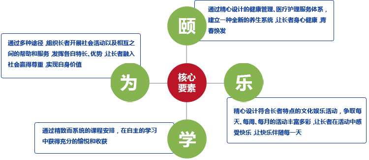 蓝城“学院式养老”围绕“颐、乐、学、为”四个核心要素,让长者享受专业高效的医疗健康服务;舒适周到的居家生活服务;丰富多彩的交流活动服务;精致全面的文化教育服务,重新构建长者的晚年生活。